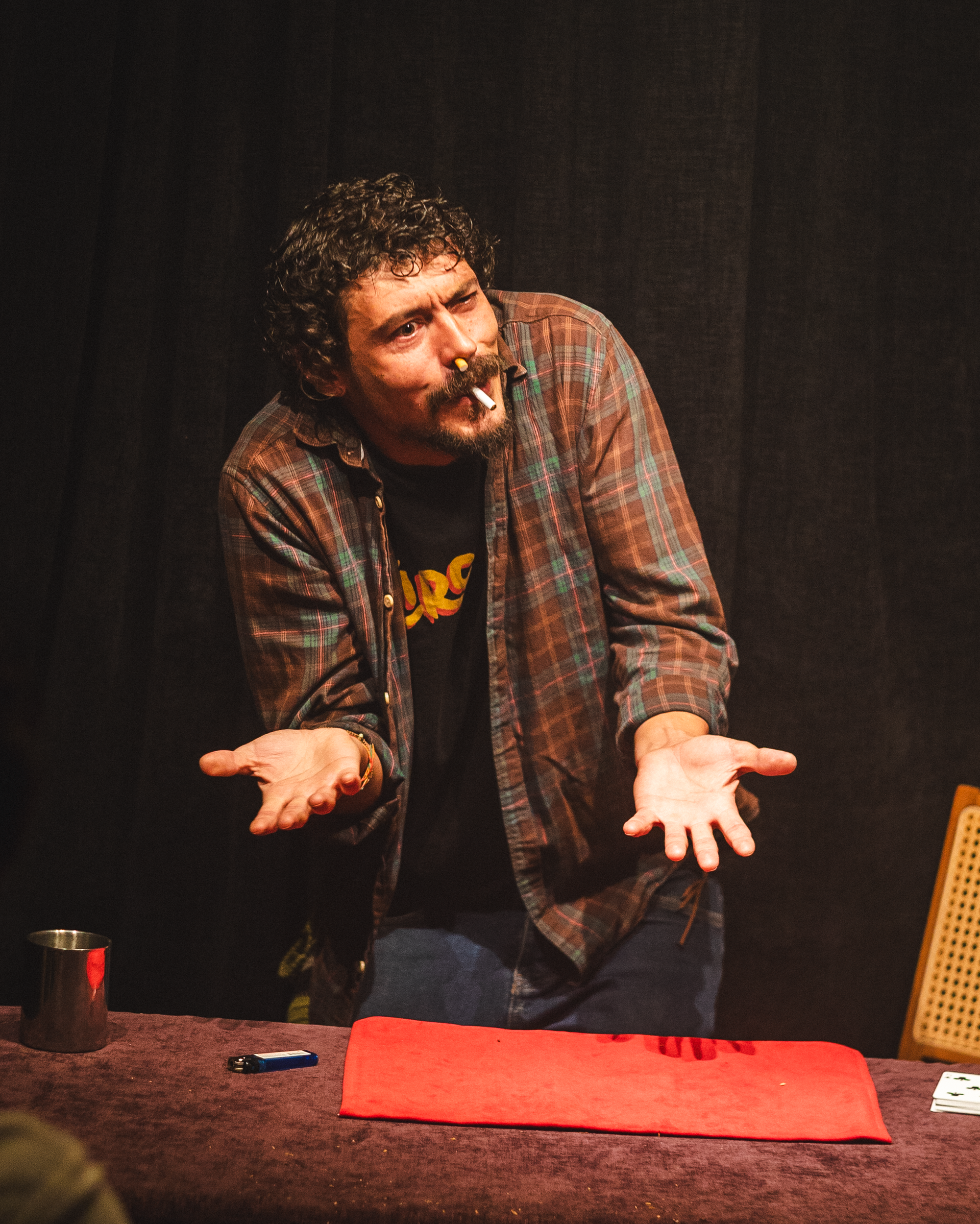 Once inside the shop, guests are greeted by hosts who give them wine or another drink of their choosing. After a brief introduction in the store, guests enter the theater space through one of those aforementioned secret doors. The theater itself has tiered seating, painted black walls, custom drapery, and is given a certain ambience with candles and a fog machine. Guests take their seats, and after a brief introduction, the performer of the night begins their 60-minute show.