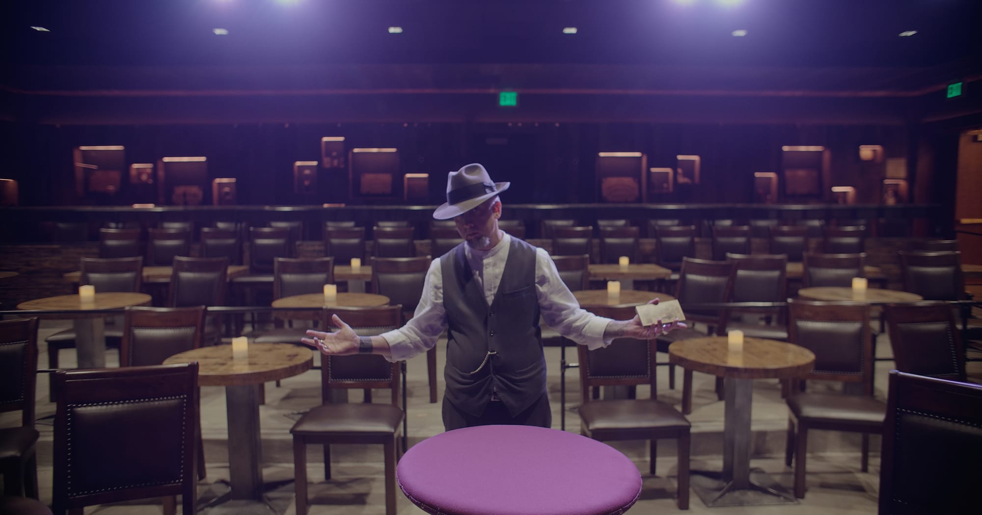 The theater is a cabaret design that accommodates 75 guests on three tiers of seating, replete with small tables where patrons can place their drinks while watching the show. “The vibe of the room is very industrial, with a speakeasy feel to it,” said Aiden. “All of the walls and the fixtures in the building are historic wood that was on property at The Stanley Hotel since 1907, and was part of the original carriage house structure.”