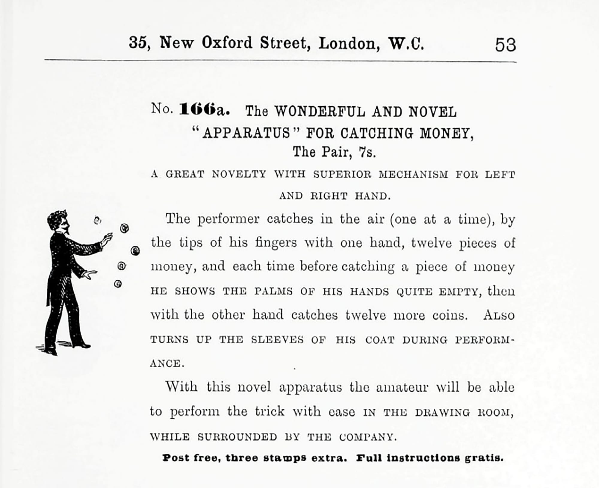 Here we have one such piece, manufactured and sold by Joseph Bland at his London shop, which was founded in 1855. Its catalog title was descriptive: “The Wonderful and Novel ‘Apparatus’ For Catching Money,” and it allowed one to catch “in the air (one at a time), by the tips of his fingers with one hand, twelve pieces of money, and each time before catching a piece of money he shows the palms of his hands quite empty, then with the other hand catches twelve more coins.”
