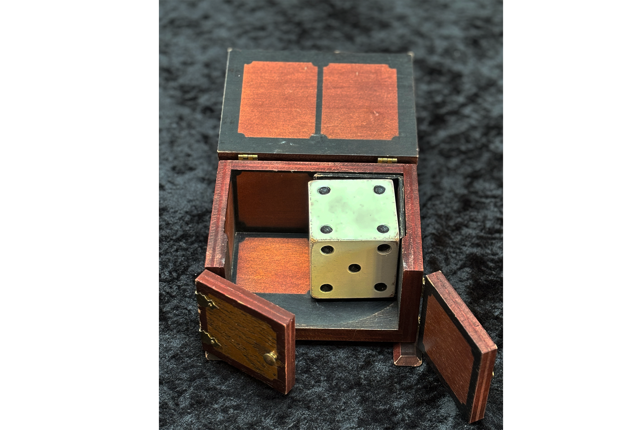 There were many aspects to the Die Box story that we didn’t have space to explain—including the many ingenious variations. I realized that the Shenanigan box was inspired by Abbott’s previous “three-sided” shell version, The Abbott Die Box. Bud, a masterful woodworker, rendered his own version in wood, and added the pivoting action.