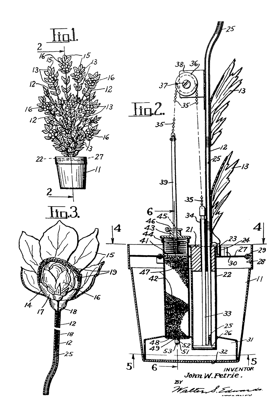 On this day in 1946, John Petrie of the Petrie-Lewis Company filed a patent for his mechanical blooming rose bush. It really was an automaton, made of metal. The mechanism was controlled by a tube of sand in the flowerpot; when the sand was released it allowed a weight to drop at a precise speed and real roses to be slowly pushed into view through the foliage. The trick was a popular P&L product, and a feature of Dante’s Broadway show in 1940.
