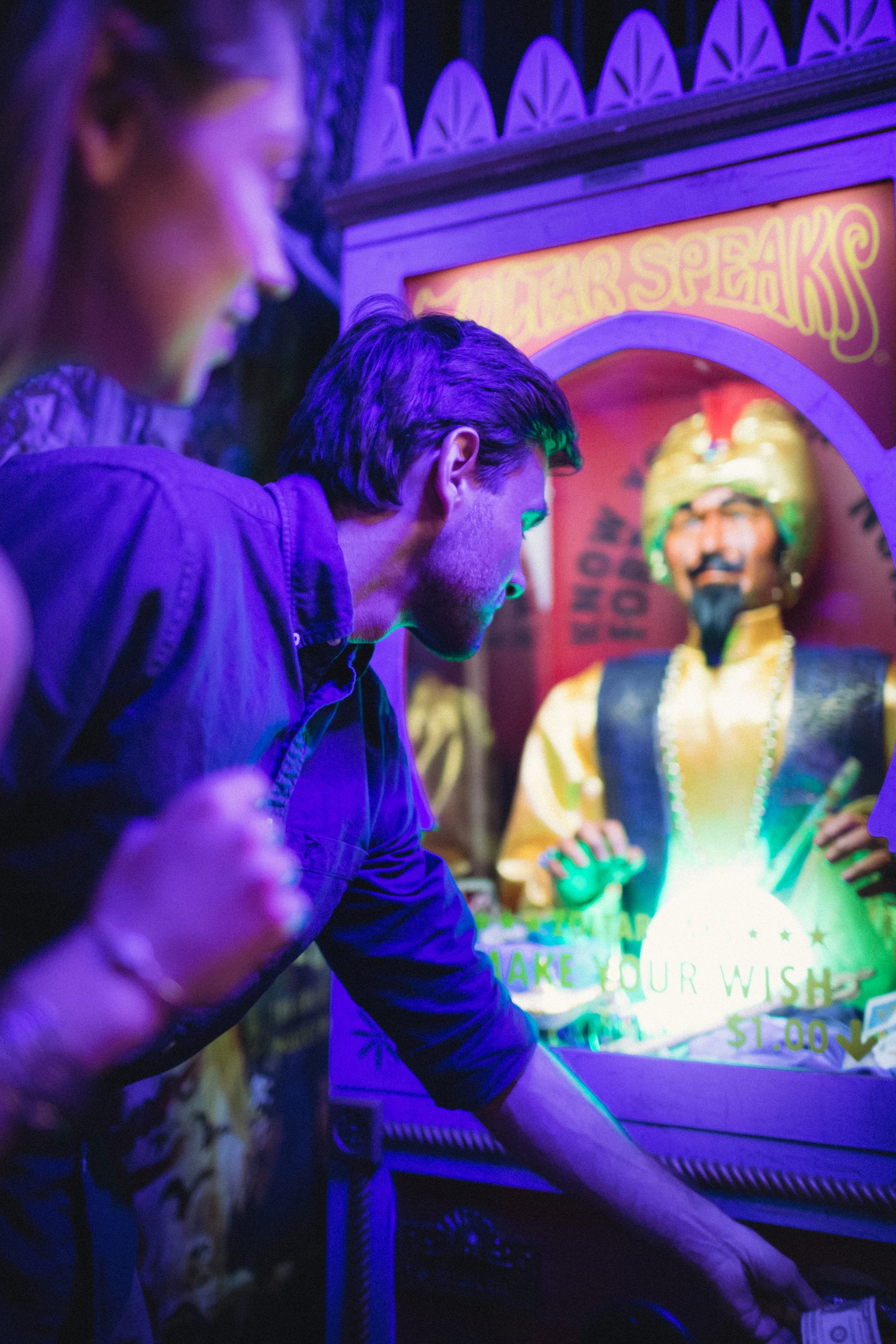Left: VIP guests in the parlor room raise their glasses to Jon Tai. Right: Liberty Magic’s lobby features a Zoltar fortune telling machine that entertains guests before the main show