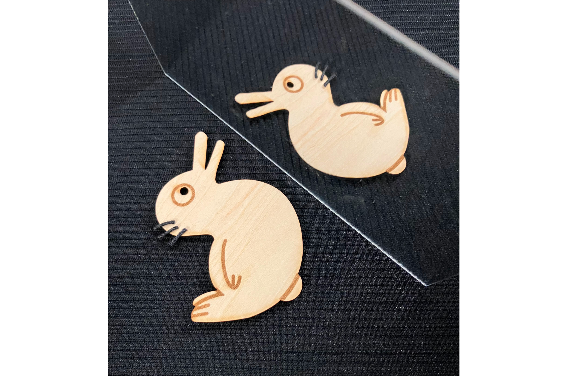 The journey begins with the duck-rabbit illusion. I’m fascinated by ambiguous objects that can have multiple expressions, and I’ve often felt that more can be made of the drawing that can be seen as a rabbit or duck depending upon its orientation. Fig. 1 shows a laser cut and engraved version that I designed. The whiskers are a recent addition. A mirror placed at 45 degrees allows a viewer to see both animals. The duck is a stronger image than the rabbit with its hunched over posture.