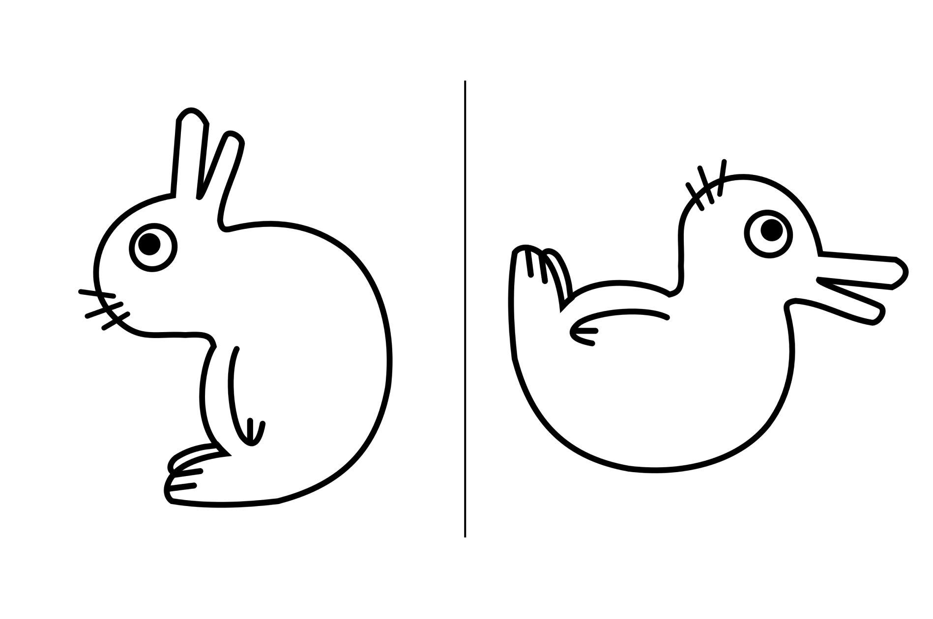 The first stop on the journey was a conversation with Nick Diffatte, which led me to create a version of the High Sign or Arrow board with the duck-rabbit image on a square board. Fig. 2 shows a design that can be printed out on cardstock before folding the sheet in half and gluing it back-to-back. Rotating the board diagonally by spinning opposite corners between your fingers will either cause the animal viewed by the audience to remain the same or switch.