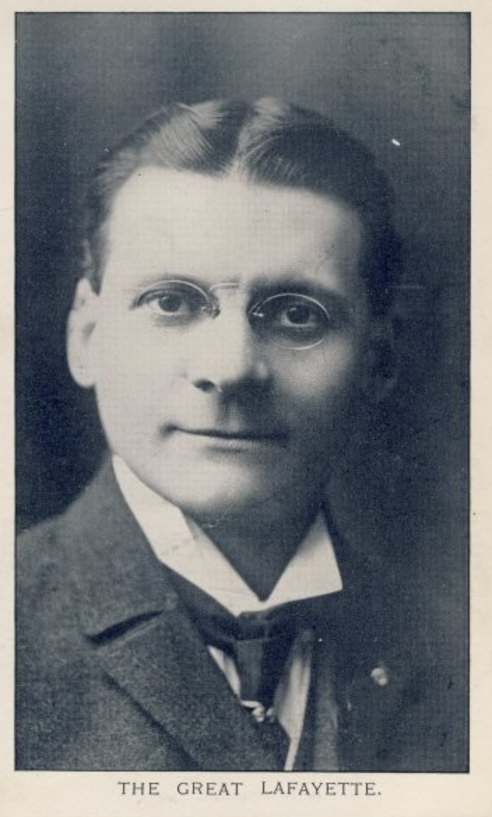 In 1904, Lafayette completed the week with his new show at the Avenue Theater in Detroit. He featured a spectacle called The Bride of Thibet (later The Lion’s Bride). A live lion paced inside a cage, center stage. A princess was pushed into the cage. The Sphinx reported, “The lion jumps towards his beautiful prey, when a bolt of lightning strikes the cage and, shattering it, releases the lion, who leaps on the [King], bearing him to the ground. [The beast] stands erect and takes off his head and we find The Great Lafayette.” The act used a cast and crew of 53 people, with props, costumes, cages, backdrops, and animals. That same week, down the street at the Temple Theater, T. Nelson Downs premiered in Detroit. Downs carried a top hat and a stack of half dollars to present The Miser’s Dream.
