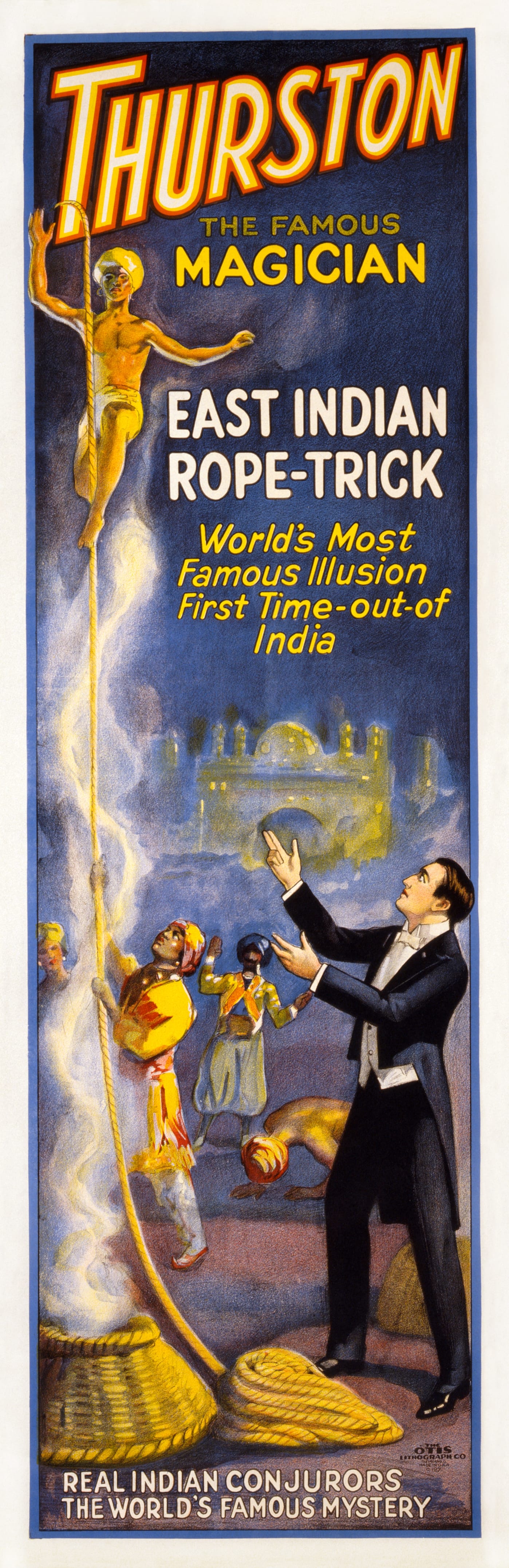 Will H. Chandlee died on this day in 1954. He was an artist with the Smithsonian Institution in Washington and an amateur magician. Chandlee discovered a new principle in optical effects; he elaborately christened it Lumen-X, and claimed to have almost sold it to Houdini and Thurston. Perhaps his most incredible claim was that Lumen-X could be arranged to duplicate the famous Indian Rope Trick—the boy that climbs to the top of the rope and instantly vanishes. Chandlee never had the chance to create it, but he offered clues about his secret. Unlike the impoverished props of an Indian street magician, he proposed an expensive purpose-built theater and a huge sheet of glass mirror.