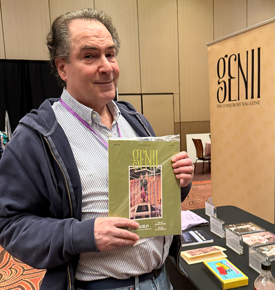 This month we’re pleased to report from March’s Mystify Magic Festival in Las Vegas. We sent a Genii contingent to the event with a pile of new magazines, t-shirts, and tote bags for the dealers’ room. This photo, from the Genii corner of the Mystify dealers’ room, shows Richard Kaufman, our former editor and current contributor, as he contemplates a new hoodie. Behind the dealer’s table was editor at large, Chloe Olewitz, and behind the camera was executive director, Julie Eng. On page 16, Rebecca Spectre shares, “The First Ever Mystify Magic Festival,” a terrific insider’s look at this new convention. There’s no question that the event generated a lot of interest—not the least of it from the lucky attendees.