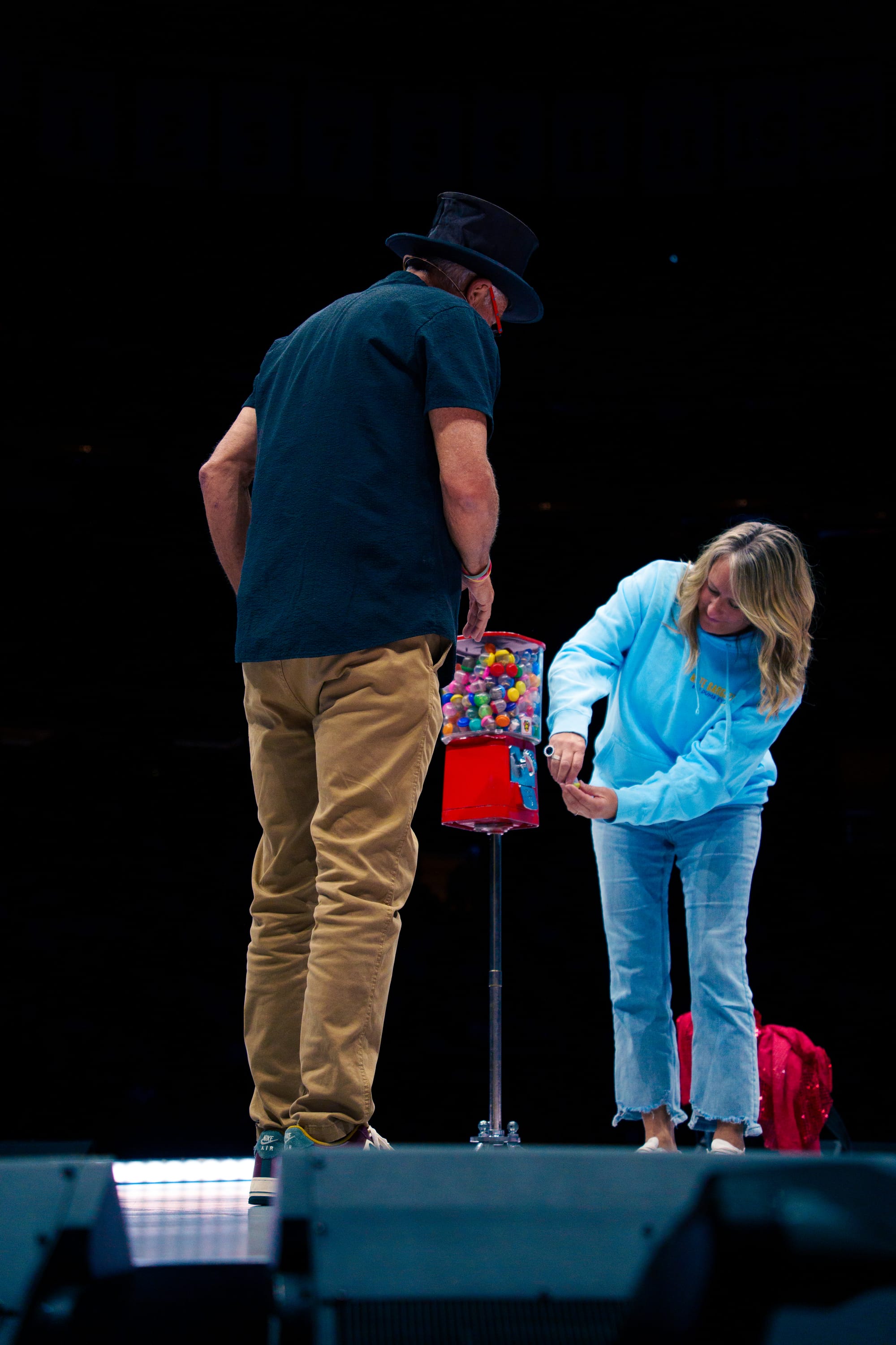 Stephen also didn’t have to worry about angles when they played theaters with traditional stages. “We faced one camera and stayed that way the whole time.” When they started playing arenas, Stephen had to learn to perform in the round. His set stayed mostly the same, only now he had to learn to aim at the cameras at the right moments and load the gumball machine in the round.