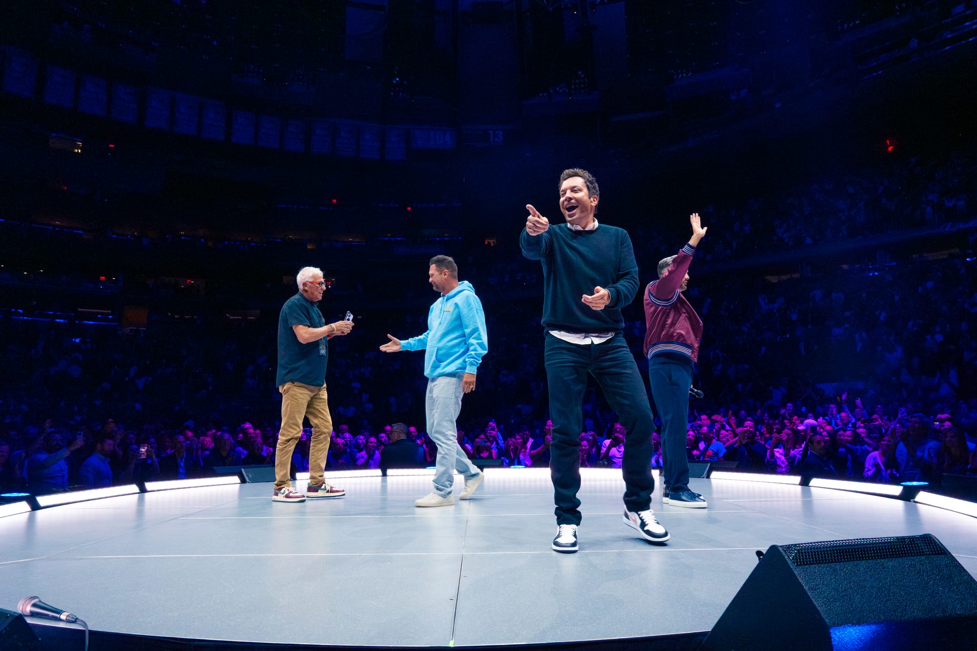 There are four camera operators spaced equally, creating four corners. There is tape on the round stage indicating where they are, so no matter which way Nate or Stephen faces, one of the cameras can pick up a perfect shot of them facing the audience. There are also two unmanned cameras mounted on the stage for close-up shots of Stephen’s hands during the bill switch.