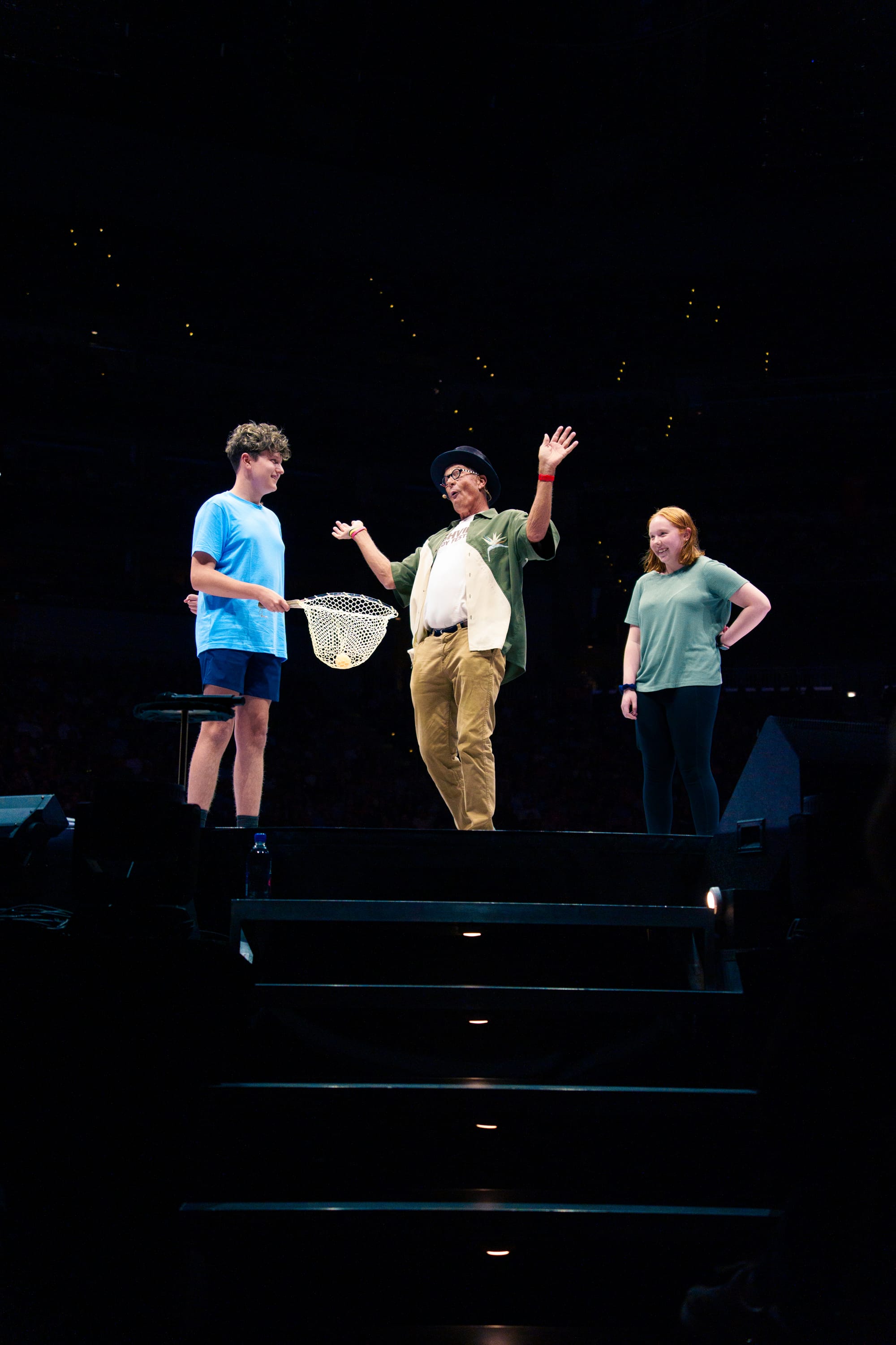 Stephen, Nate, and their warm-up act, Julian McCullough, travel to shows together with all the video equipment. (So does Stephen’s daughter Abigail, who is also his manager.) This includes massive screens and cameras, along with the camera operators and director. By using the same TV crew at every show, the director knows how to shoot Stephen’s performance. Because it’s always the same, Stephen knows how to face the cameras at the most important moments of the act: when he does the bill switch, when the spectator holds up her signed card, even when the spectator puts the quarter into the gumball machine and turns the handle.