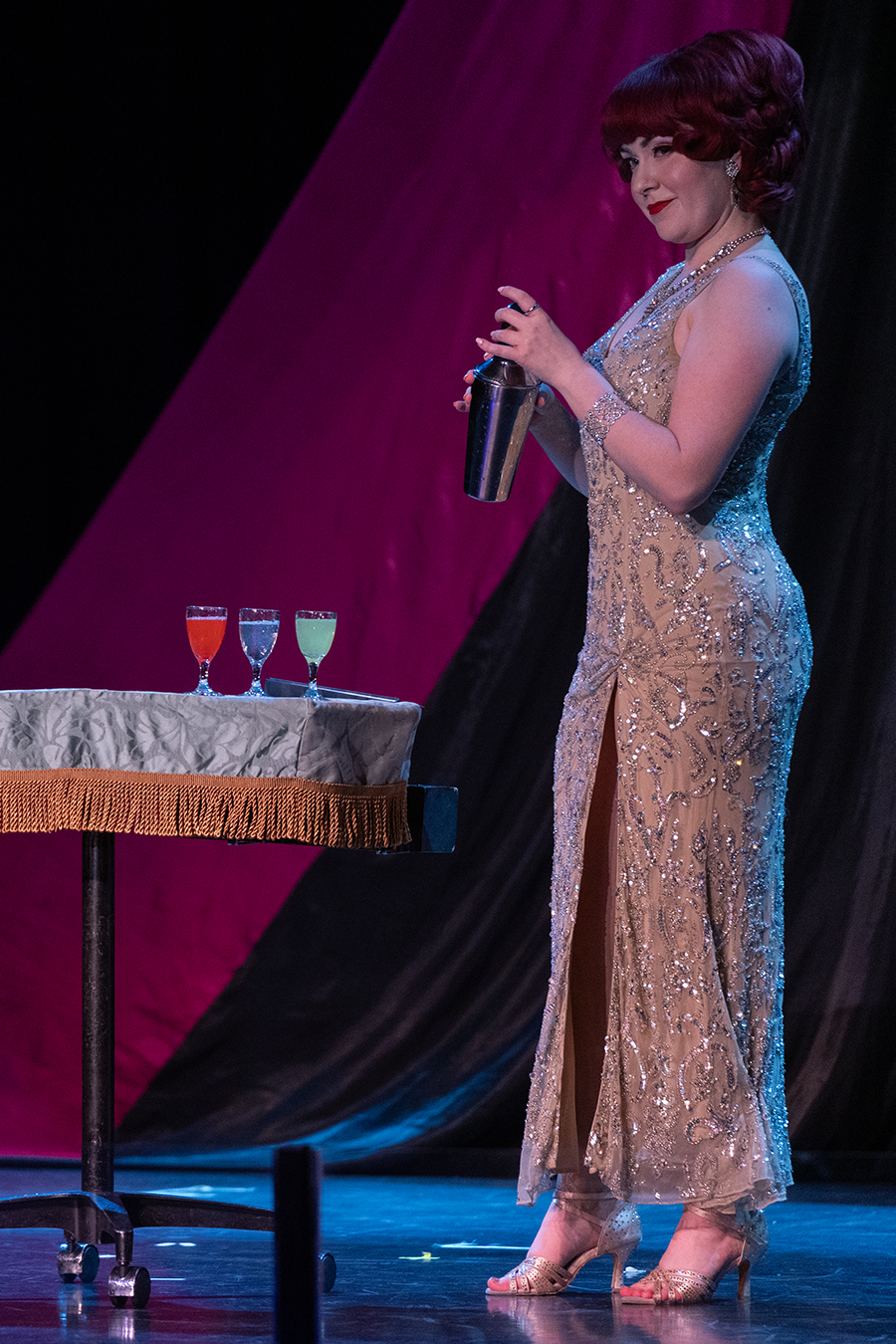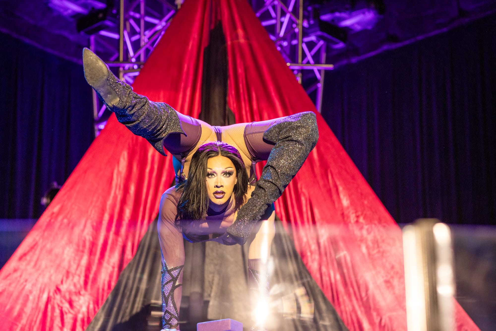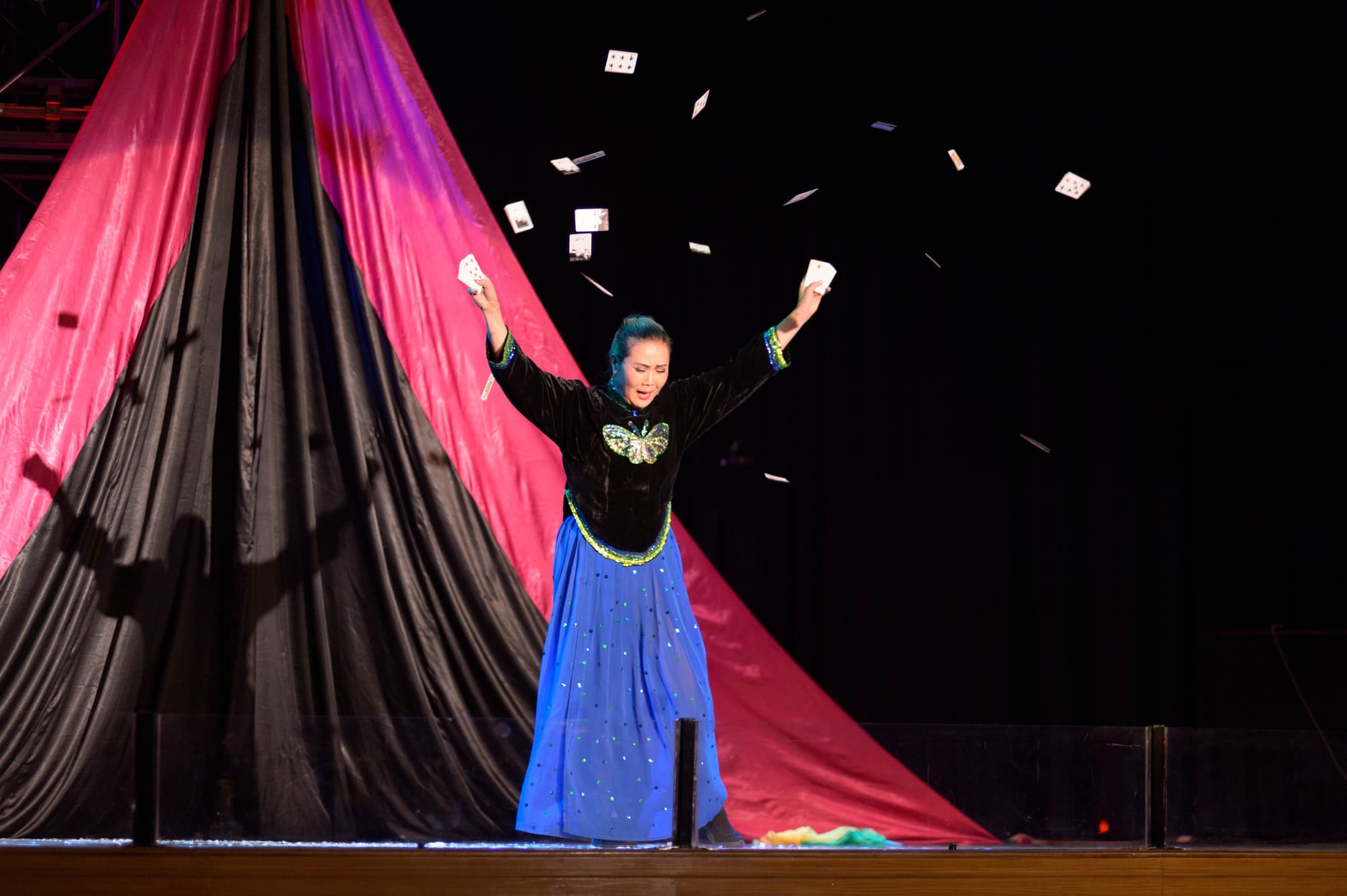 Cards fly as Juliana Chen opens the first gala show; Cate Great towers in the opening gala / Photos by Charles Ryan-Barber