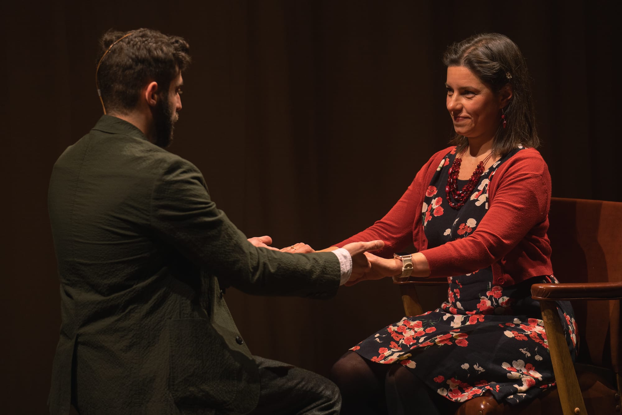 It’s a powerful theatrical moment. It’s also a risky approach, as DePonto learned early on when performing Q& A for a particularly emotional person for the first time. “I had left the stage feeling like an imposter,” he says. (Note: During both of the performances of Mindplay I attended, volunteers from the audience either choked up or were moved to tears.)